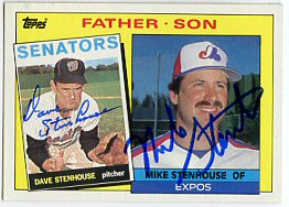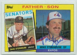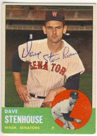 1962 Topps (upper left), 1963 Fleer (upper middle), 1963 Topps (upper right), 1965 Topps (lower left) and 1985 Topps, that he also had his son, Mike, sign (right)